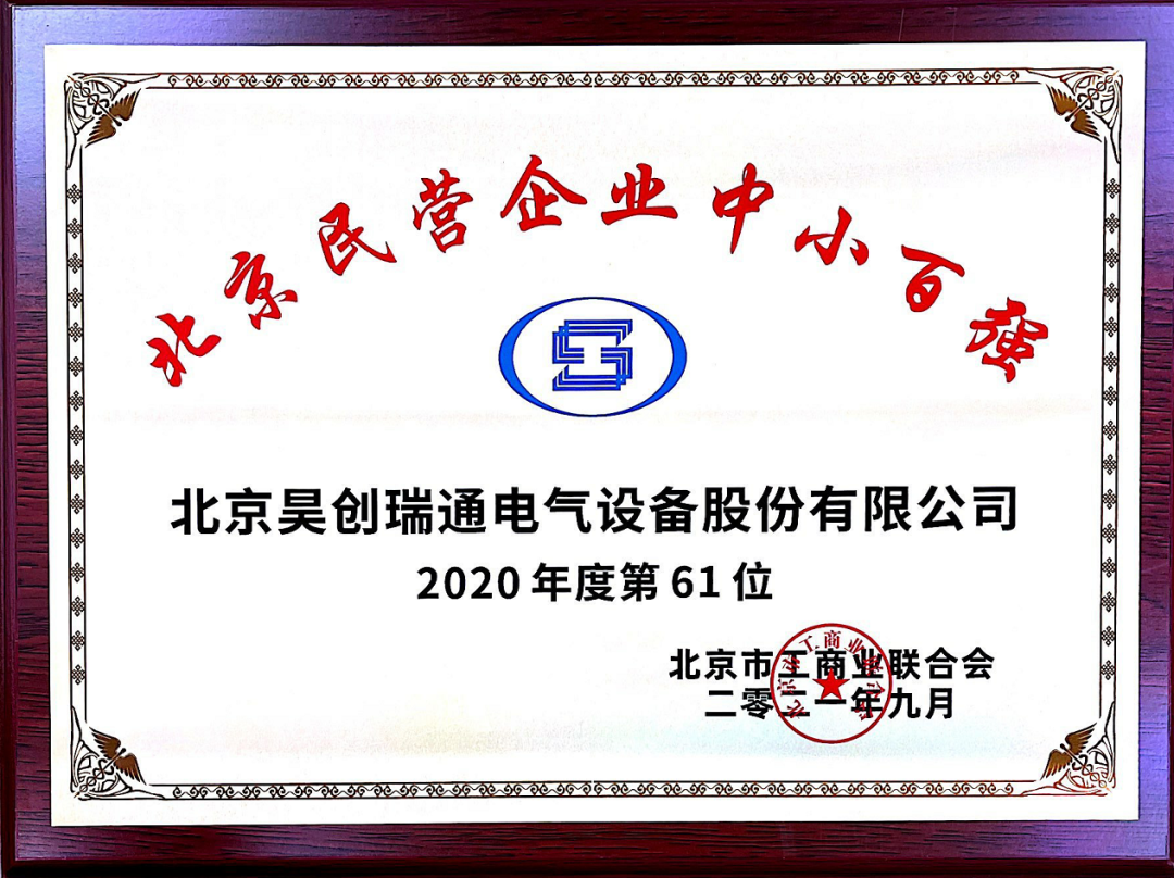 On September 16, the Beijing Federation of Industry & Commerce held the "2021 Top 100 Private Enterprises in Beijing Release Conference", and released the "1+4" top 100 list of private enterprises in Beijing. Our company was fortunately selected as the honorary title of the top 100 private small and medium-sized enterprises in Beijing in 2020, ranking 61st.